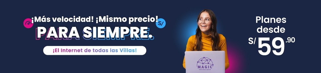 Promociones exclusivas para clientes nuevos. La velocidad mínima garantizada es del 70% conforme a la normativa vigente. Para la verificación de la velocidad, el test debe realizarse desde una computadora de escritorio o laptop conectada directamente por cable de red al módem, sin el uso de WiFi ni dispositivos intermedios, y asegurando que no existan otros equipos consumiendo ancho de banda durante la prueba. Los precios incluyen IGV y la promoción se mantiene válida mientras los servicios permanezcan activos.