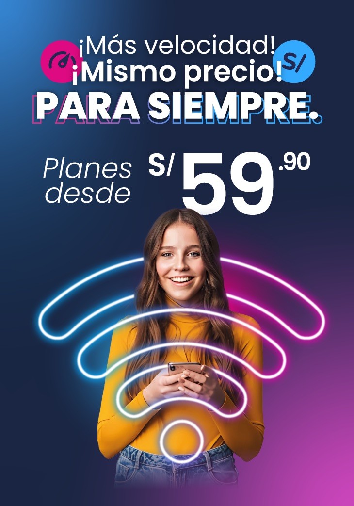 Promociones exclusivas para clientes nuevos. La velocidad mínima garantizada es del 70% conforme a la normativa vigente. Los precios incluyen IGV y la promoción se mantiene válida mientras los servicios permanezcan activos. El servicio dúo tiene un costo adicional de S/ 15; sin embargo, si el pago se realiza después del corte del servicio, el monto aplicable será de S/ 20.